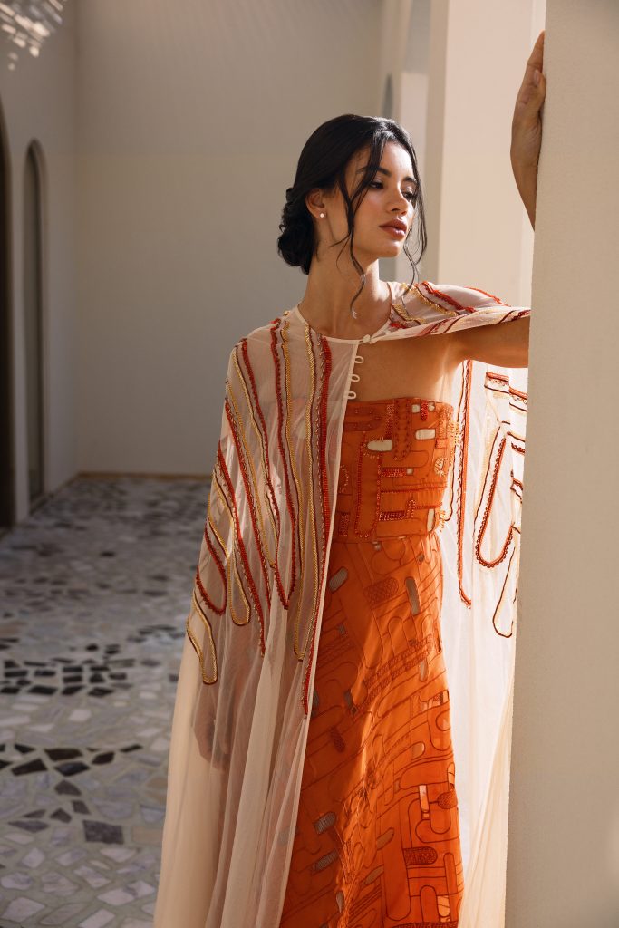 كما قمنا بتصميم قماش الأورجانزا المطرز الخاص بنا، والذي تم استخدامه في صنع أحد الفساتين، ليعكس طابعًا حصريًا ومميزًا للمجموعة.