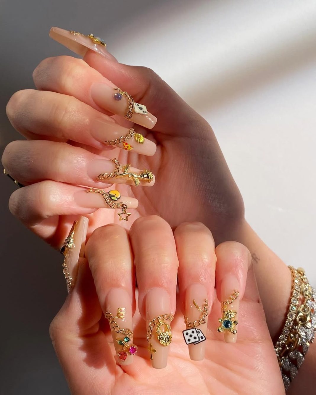 في عام 2025، لم تعد المجوهرات حكرًا على الرقبة أو المعصم، بل امتدت لتزيّن أطراف الأصابع بجرأة وأناقة غير مسبوقة. فقد دخلت سلاسل الزينة الصغيرة والقطع المتدلية عالم الأظافر بقوة، لتصبح صيحة جمالية لافتة تجمع بين الفخامة والابتكار. تخيّلي أظافرك كقطع فنية مزينة بالألماس المتدلي الذي يلمع مع كل حركة، أو سلاسل رقيقة تتراقص مع أناملك، تضيف لمسة من الأنوثة والتميز. لم يعد ثقب الأظافر مقتصرًا على الجُرأة فقط، بل أصبح أسلوبًا عصريًا تكمّله حلقات صغيرة أو حروف لامعة تعبر عن اسمك أو رسالتك. وحتى لمحبات التفاصيل الناعمة، ظهرت تصاميم تستلهم من قلادات العنق، حيث تمتد السلسلة على الظفر مزينة بزهور أو قلوب أو حتى نجوم صغيرة. إنها لمسة تزيينية تمنحك ربيعًا دائمًا على أطراف أصابعك، وتجعل من الأظافر مساحة جديدة للتعبير عن شخصيتك بأسلوب أنيق وغير تقليدي.