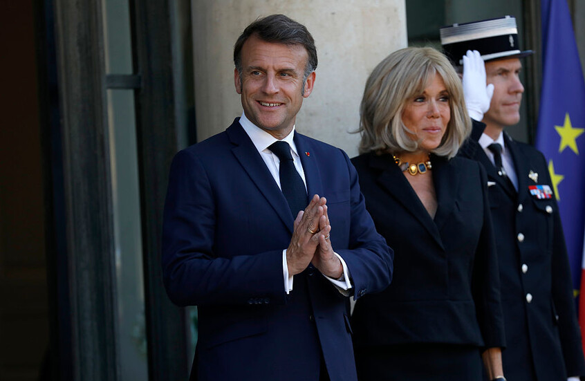 وقد بدا أن ماكرون تفاجأ من الموقف، حيث تراجع بخفة وقطب حاجبيه، قبل أن يدرك أن الباب قد فتح، ثم تمالك نفسه ووجه التحية للحضور، وتقدم برفقة بريجيت نحو السلم. وحاول الإمساك بذراعها لمساعدتها على النزول من السلم، لكنها رفضت.