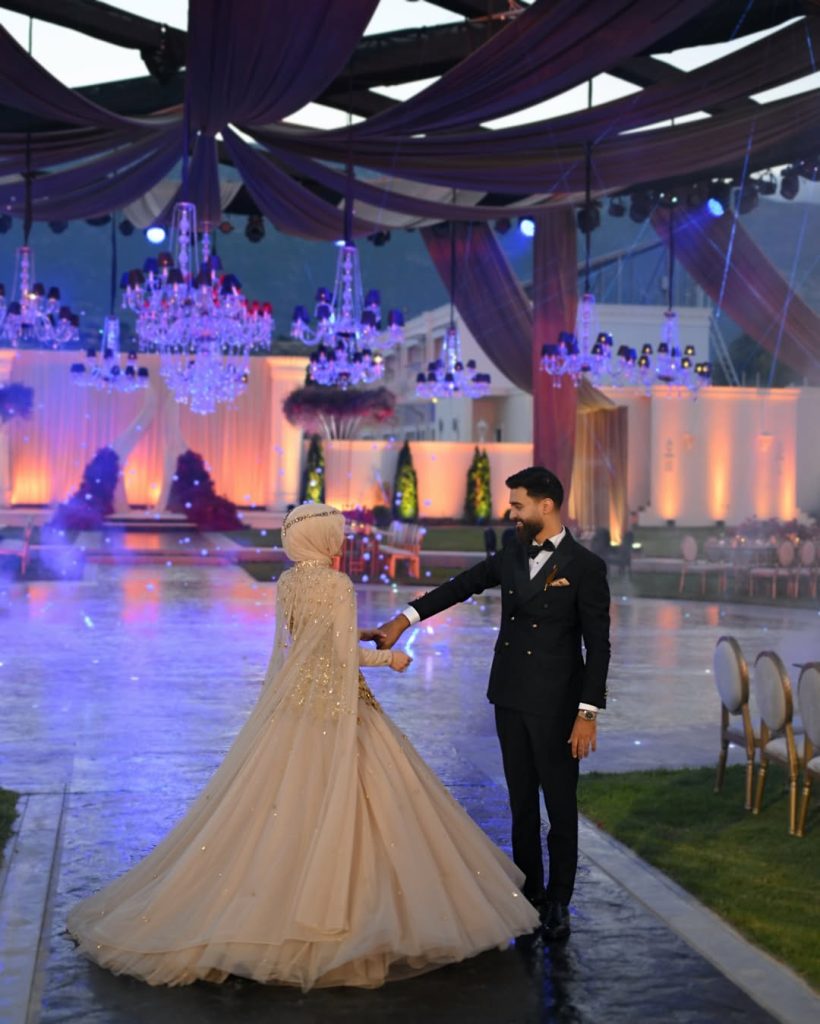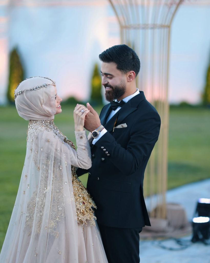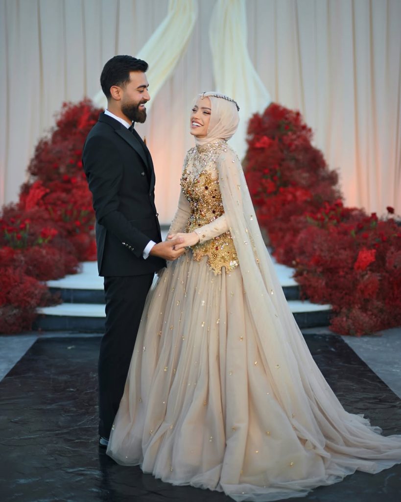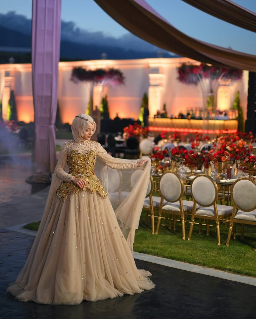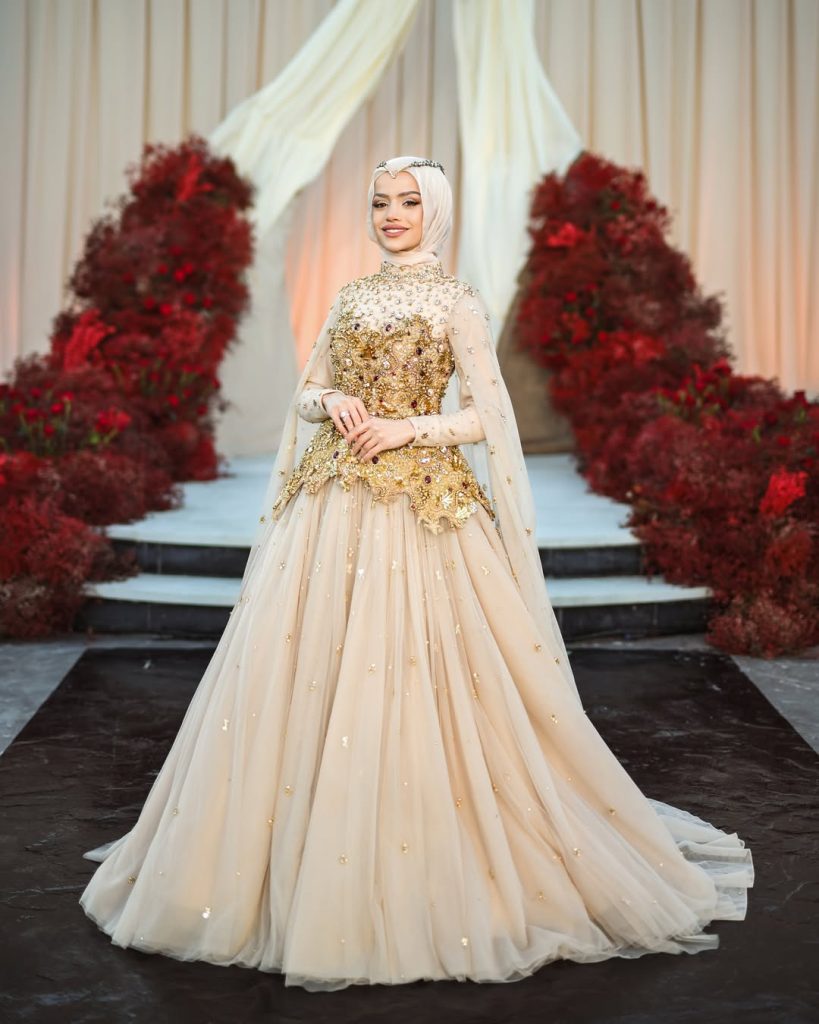 لفتت عبير الأنظار بإطلالة أنيقة ومحتشمة من تصميم دار الأزياء Khaled & Marwan، تحت إشراف المصمم الأردني خالد الصيفي واللبناني مروان ماضي، حيث تألقت بفستان بيج بتطريزات ذهبية ناعمة وأحجار عنّابية، تميّز بتفاصيل “الكاب” المطرّز يدوياً وكورسيه عصري وتنورة منفوشة مرصعة بكريستال شواروفسكي.
