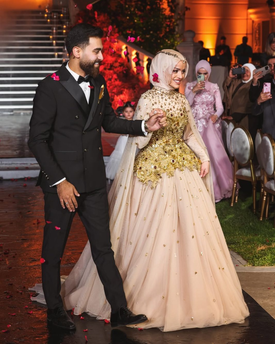 لفتت عبير الأنظار بإطلالة أنيقة ومحتشمة من تصميم دار الأزياء Khaled & Marwan، تحت إشراف المصمم الأردني خالد الصيفي واللبناني مروان ماضي، حيث تألقت بفستان بيج بتطريزات ذهبية ناعمة وأحجار عنّابية، تميّز بتفاصيل “الكاب” المطرّز يدوياً وكورسيه عصري وتنورة منفوشة مرصعة بكريستال شواروفسكي.