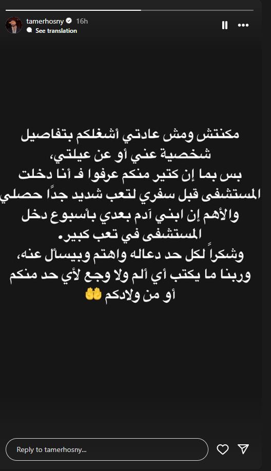 وكتب تامر عبر خاصية القصص القصيرة على حسابه في “إنستغرام”: “مكنتش ومش عادتي اشغلكم بتفاصيل شخصية عني أو عن عيلتي، بس بما إن كتير منكم عرفوا، فأنا دخلت المستشفى قبل سفري لتعب شديد جدًا حصلي، والأهم إن ابني آدم بعدي بأسبوع دخل المستشفى برضه في تعب كبير”.