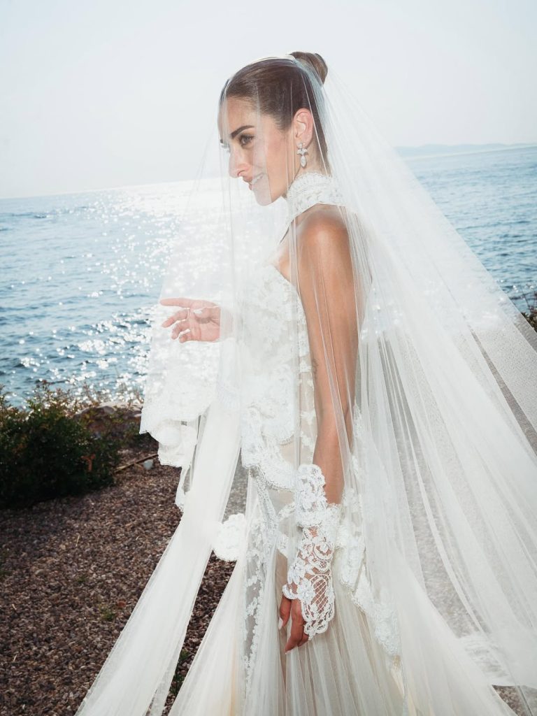 اللمسات الدقيقة ظهرت بوضوح على ياقة الفستان وحوافه التي طُرزت بدقة بالدانتيل، فيما انسدلت طرحة طويلة زُيِّنت أيضًا بالدانتيل المتناسق مع قفازات ناعمة، ما منح اللوك طابعًا مميزًا وأنيقًا.