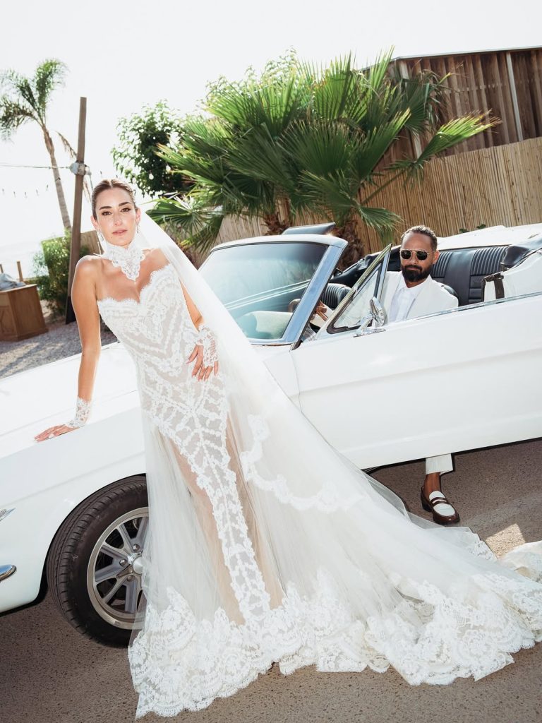 العروس تألقت بإطلالة أنيقة حملت توقيع Maison Yeya للمرّة الثانية، حيث اختارت فستانًا بلمسة فنية وذوق رفيع. التصميم جاء بقصة Structured أبرزت أنوثتها برقي، وزيِّن الفستان بدانتيل ناعم، مع تفاصيل سترابلس عند الصدر، مما أضفى على الإطلالة طابعًا شاعريًا.