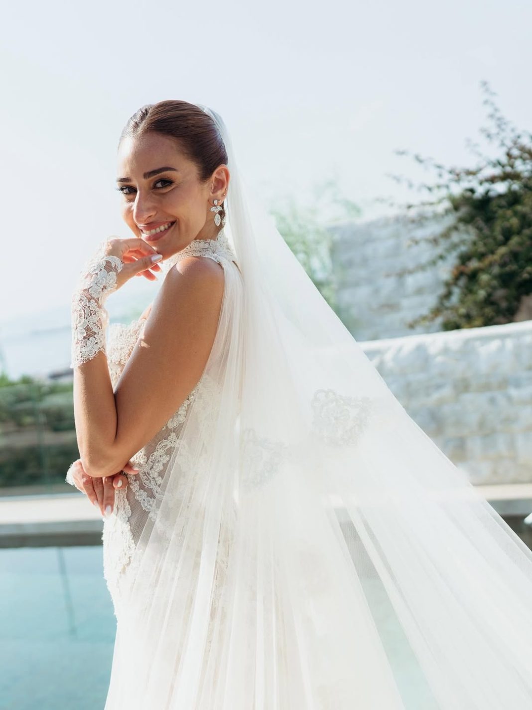 اللمسات الدقيقة ظهرت بوضوح على ياقة الفستان وحوافه التي طُرزت بدقة بالدانتيل، فيما انسدلت طرحة طويلة زُيِّنت أيضًا بالدانتيل المتناسق مع قفازات ناعمة، ما منح اللوك طابعًا مميزًا وأنيقًا.