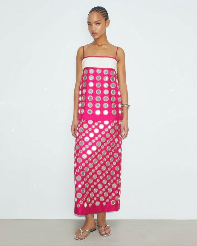 من بين القطع التي أثارت إعجاب عشاق الموضة، يبرز فستان ماكسي من Tory Burch يتميز بتصميمه الأنثوي وألوانه النابضة بالحياة، كالوردي والأصفر، وتغطيه دوائر مرايا صغيرة تعكس الضوء بطريقة آسرة. وقد شوهد هذا الفستان مراراً في حفلات الزفاف والمناسبات، وتصدّر صور العديد من مؤثّرات الموضة على إنستغرام، حتى أصبح من القطع الأكثر تداولاً لهذا الموسم.