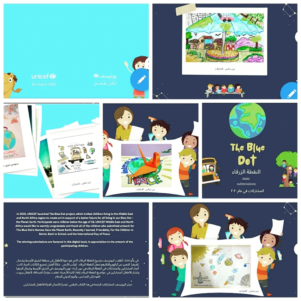 أما زين، فبعد رحيل محمود، ركّزت على تنمية قدراته بالرسم. اكتشفت أنه يستطيع رسم ما يُعرض عليه، حتى وإن كانت حركته محدودة. وشارك في مسابقة “النقطة الزرقاء” التي أطلقتها اليونيسف في الشرق الأوسط وشمال إفريقيا، والتي طرحت سبع مواضيع خلال سبعة أسابيع. تمكن زين من إتمام أعماله الفنية، وتم اختيار أربع من رسوماته لتُنشر في كتاب رقمي عالمي، انتشر في دول عدة حول العالم.