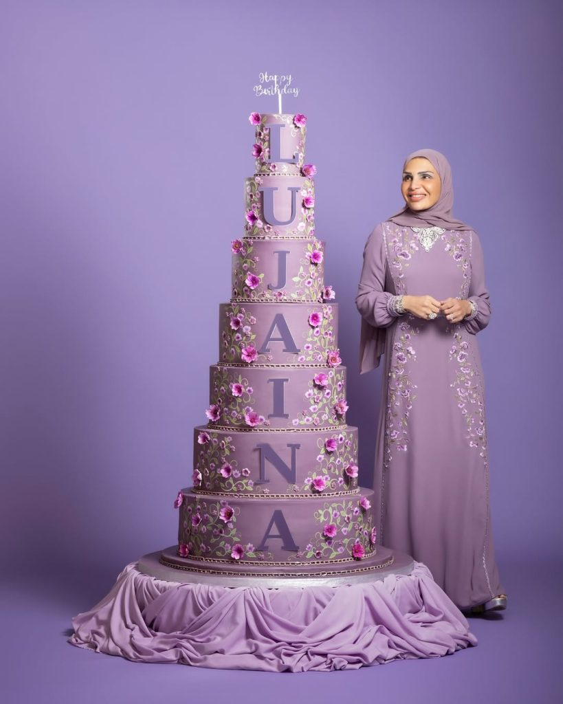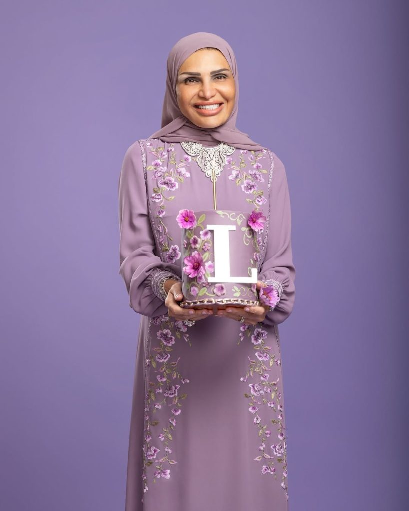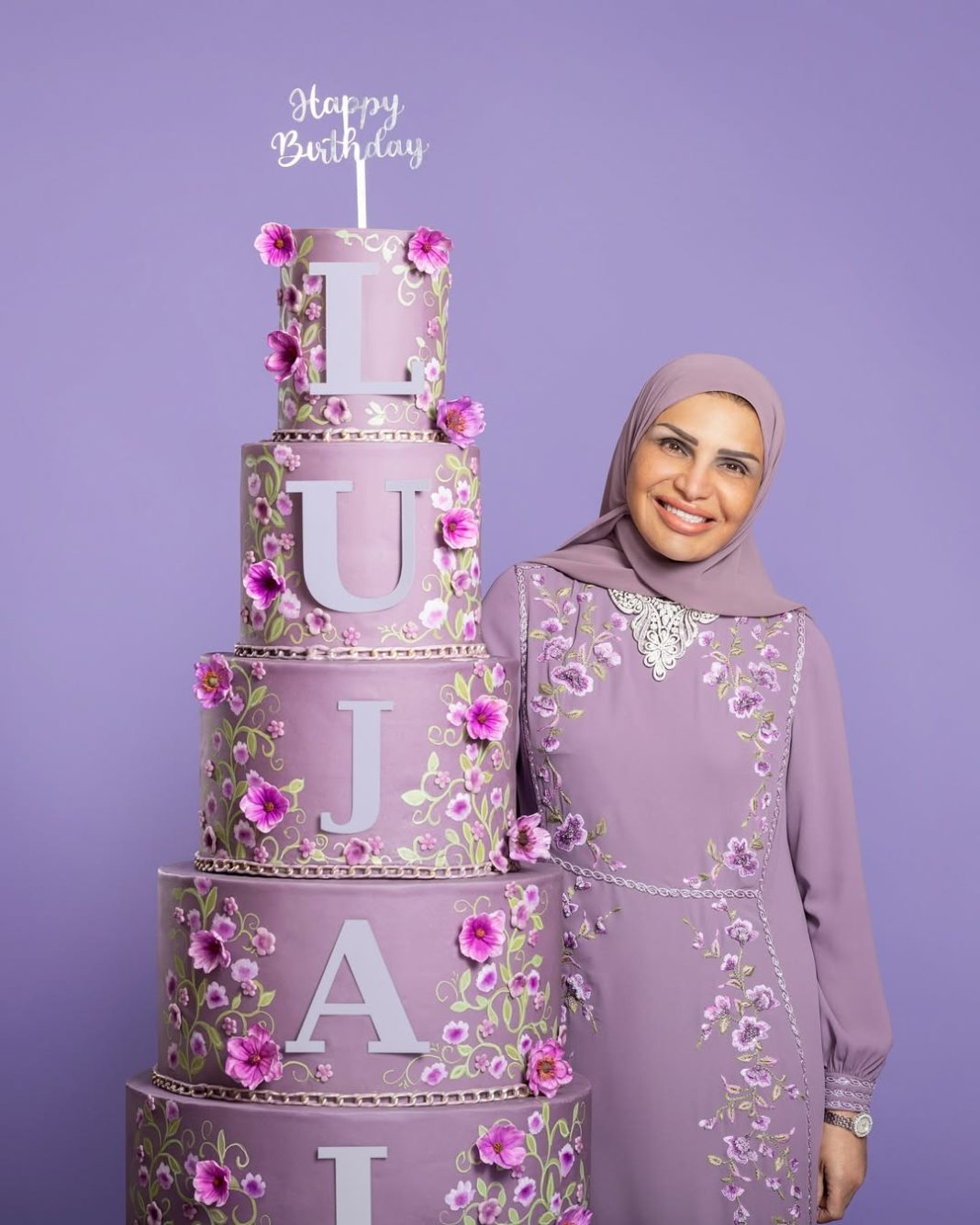 وظهرت لجينة في إحدى الصور بجانب كيكة كبيرة باللون الموف مزينة بالورود وتحمل أحرف اسمها، في أجواء يملؤها الأناقة والبهجة.
