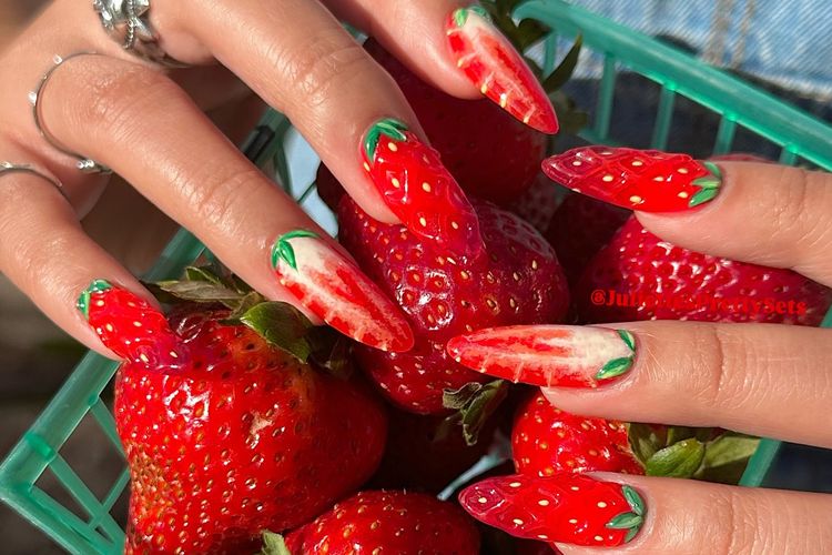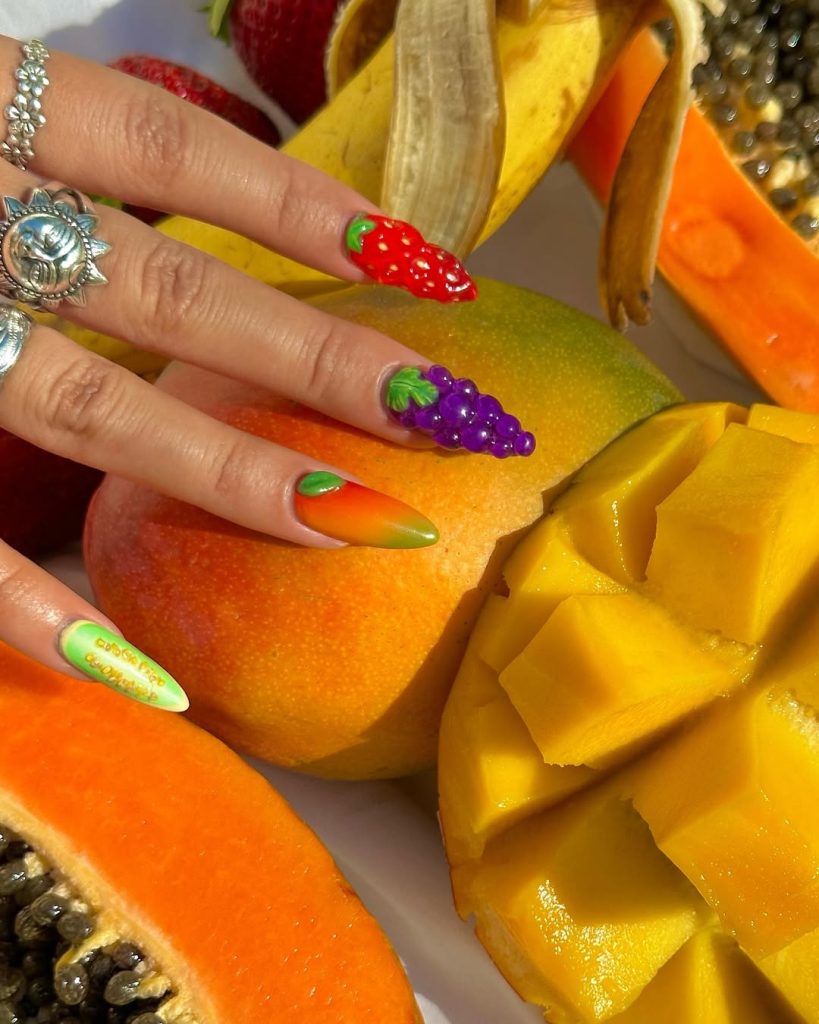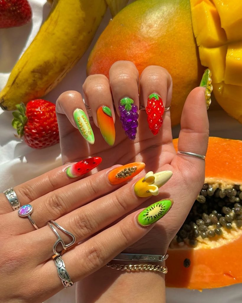 هو تصميم أظافر يحاكي مظهر قشرة الفاكهة بدقة، من حيث اللون والملمس والتفاصيل الدقيقة كالنقاط والتدرجات، ليمنح الظفر مظهراً فنياً شبيهاً بسطح الفواكه مثل المانجو، التفاح أو الخوخ.