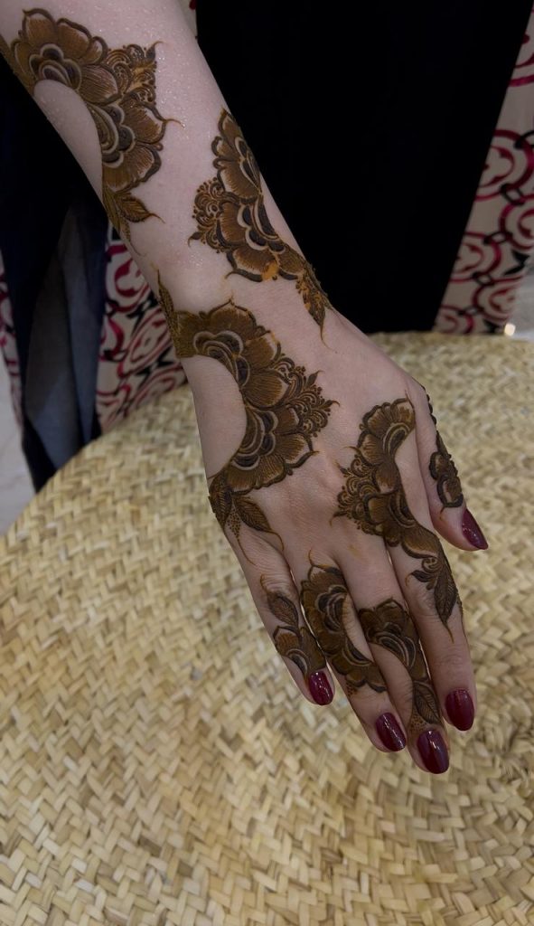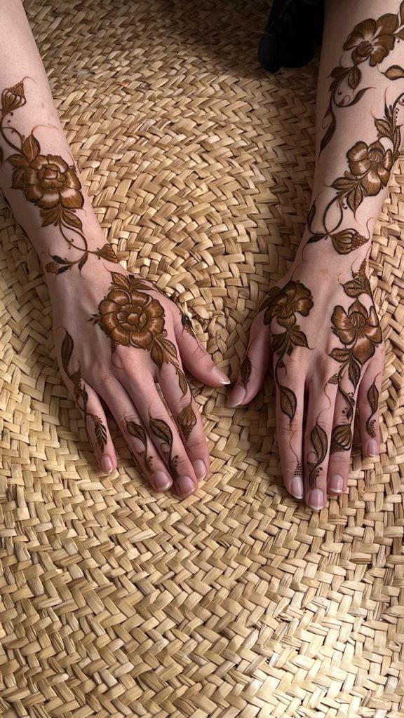 تقول آمنة: “البنات ابتعدن تمامًا عن النقوش التي تغطي كامل اليد. الآن تفضّل العروس نقشًا ناعمًا، متفرقًا، يبرز جمال اليد بدلًا من تغطيته بالكامل.” تضيف أيضًا أن هذا التوجه يجعل اليد أكثر نعومة في الصور، ويتناغم مع مختلف أنماط فساتين الزفاف والخطوبة.