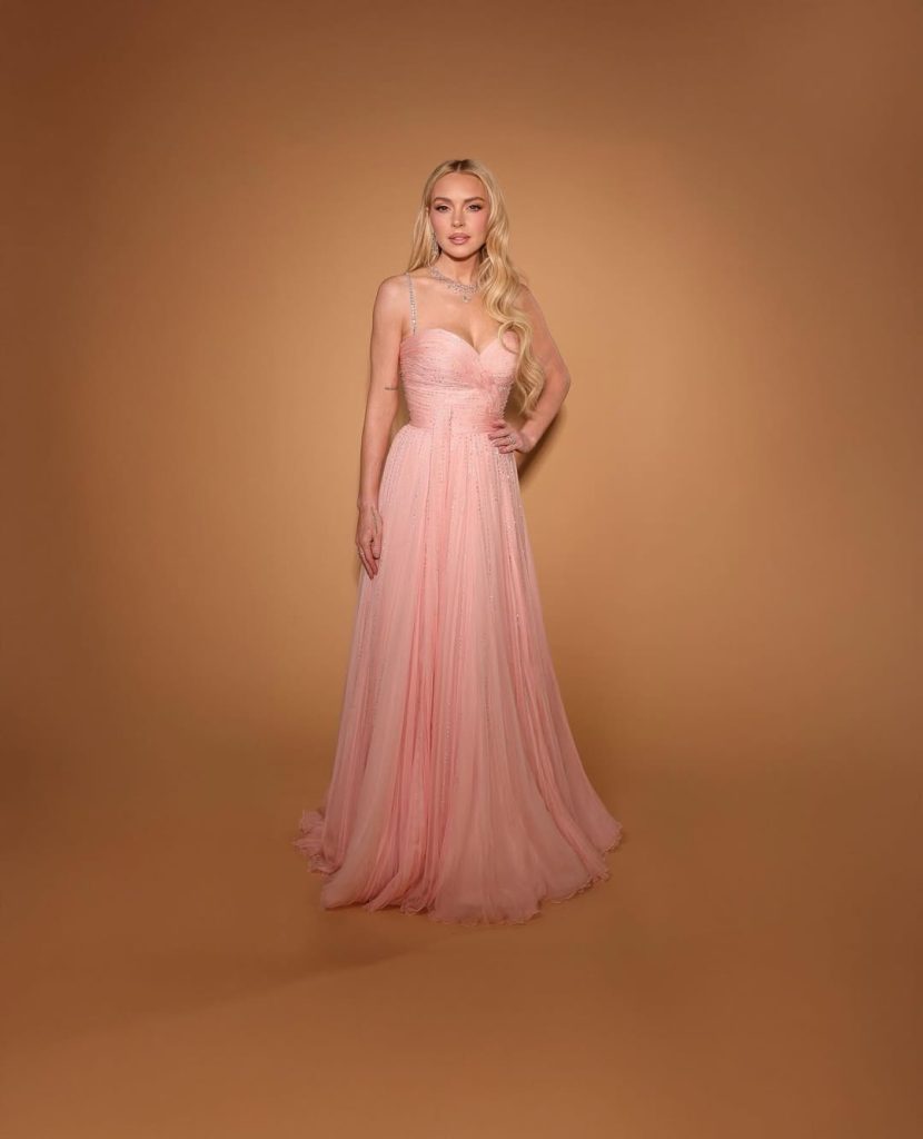 اختارت الممثلة الأمريكية ليندسي لوهان إطلالة أنثوية وناعمة خلال العرض الأول لفيلمها الجديد Freakier Friday في لوس أنجلوس، حيث تألقت بفستان وردي طويل بتصميم كورسيه وياقة على شكل قلب، مزوّد بحمالات مرصعة وتفاصيل مطوية أضفت لمسة رومانسية هادئة.