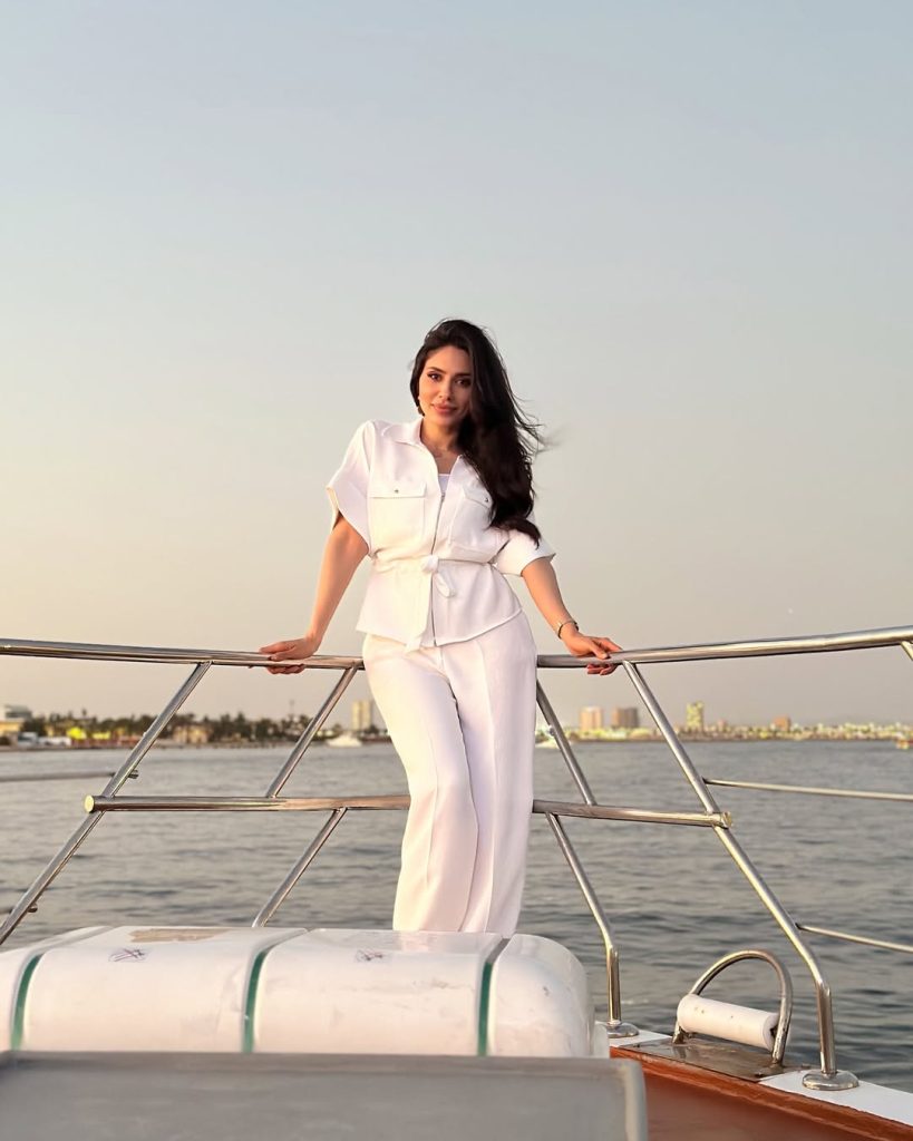 🔸 وفي الإطلالة الثالثة، انتقلت إلهام إلى أجواء أكثر عصرية وحيوية على متن مركب في البحر، حيث اعتمدت طقمًا أبيض كاجوال من سترة وبنطلون، أظهر جانبها الشبابي المنطلق.