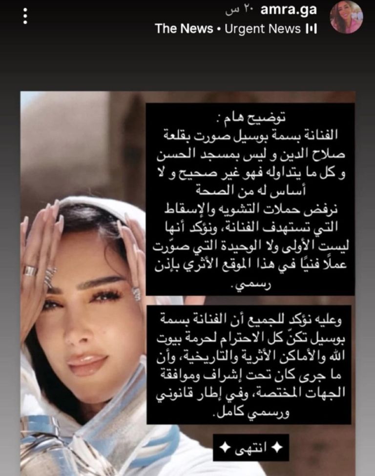 وشددت الرحموني على أن العديد من الفنانين سبق أن صوّروا أعمالًا في مواقع أثرية مشابهة، مضيفة: “بسمة ليست الأولى ولن تكون الأخيرة، وكل ما جرى تم في إطار قانوني ورسمي كامل، بعيدًا عن أي إساءة أو تجاوز”.
