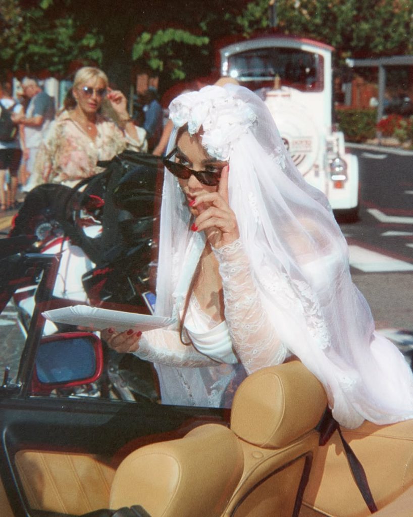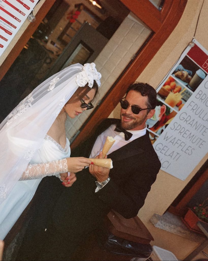 أما الطرحة المتوسطة المزيّنة بالورود والدانتيل المطرز بحبّات الستراس اللامعة، فقد أضفت سحراً خاصاً على الإطلالة. واللافت أنّ وهبي كسرت القواعد التقليدية للعروس، فاختارت نظارات شمسية عصرية بتصميم “عيون القطة”، وانتعلت شبشباً أبيض مسطحاً منح إطلالتها لمسة عفوية مميزة.