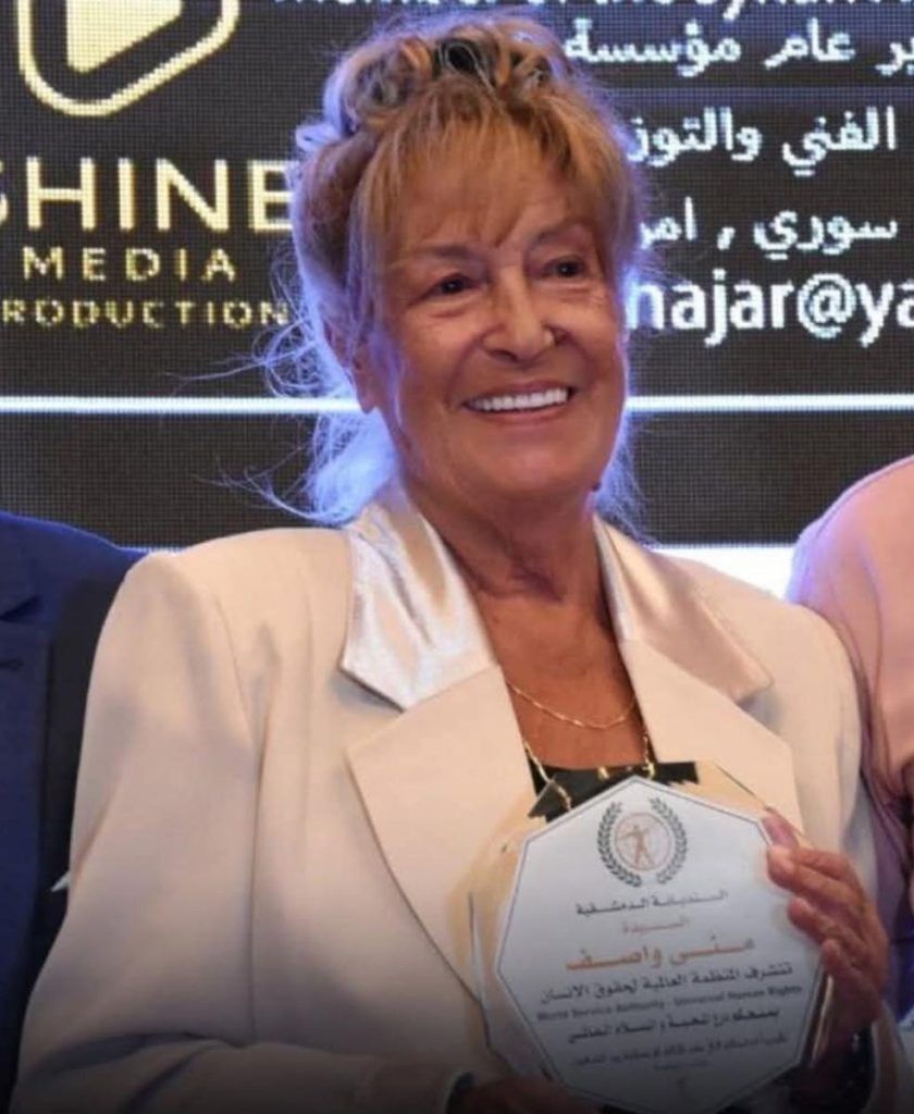 حظيت الفنانة السورية القديرة منى واصف بتكريم مميز من قبل المنظمة العالمية لحقوق الإنسان، حيث أُطلق عليها لقب “سفيرة السلام في العالم”، اعترافًا بمسيرتها الفنية الطويلة وإسهاماتها في الدراما السورية والعربية، إضافة إلى دورها الإنساني في تعزيز قيم المحبة والتضامن بين الشعوب.