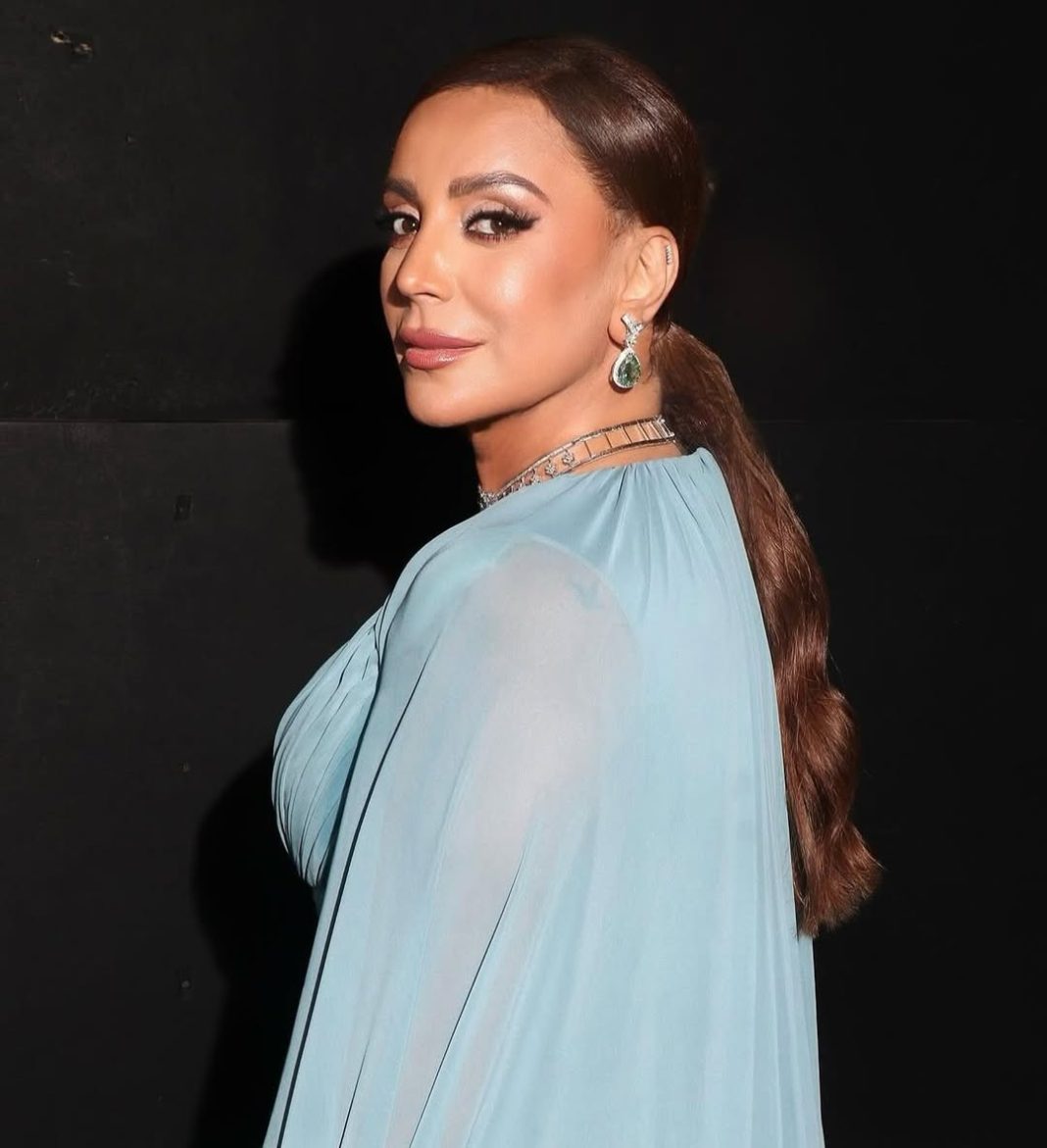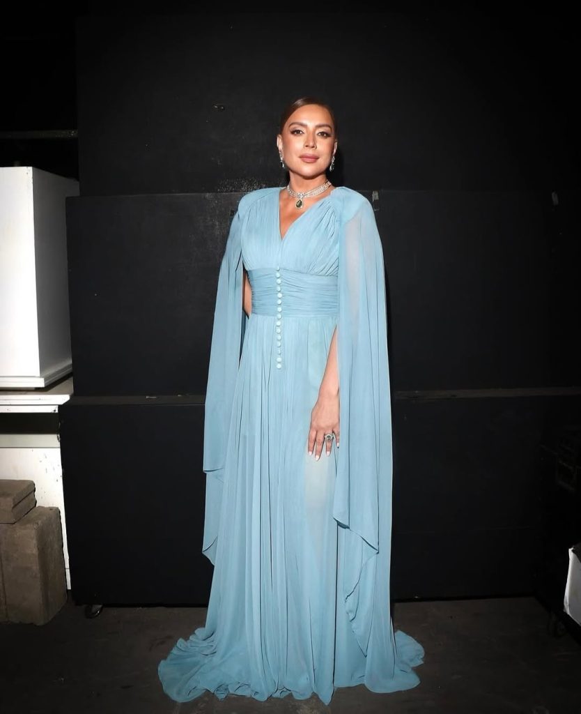 إطلالة شكران لم تقل سحراً عن كلماتها المؤثرة؛ فقد اختارت فستاناً أزرق بتوقيع Maison 7، جاء بتصميم (Cape Dress) طويل وانسيابي بلمسات من الأزرار الزرقاء والياقة العميقة، ما منحها حضوراً مهيباً على السجادة الحمراء. وزيّنت إطلالتها بمجوهرات فاخرة من Or Di Rima مرصعة بالألماس والزمرّد، مع حذاء فضي أنيق أكمل المشهد.