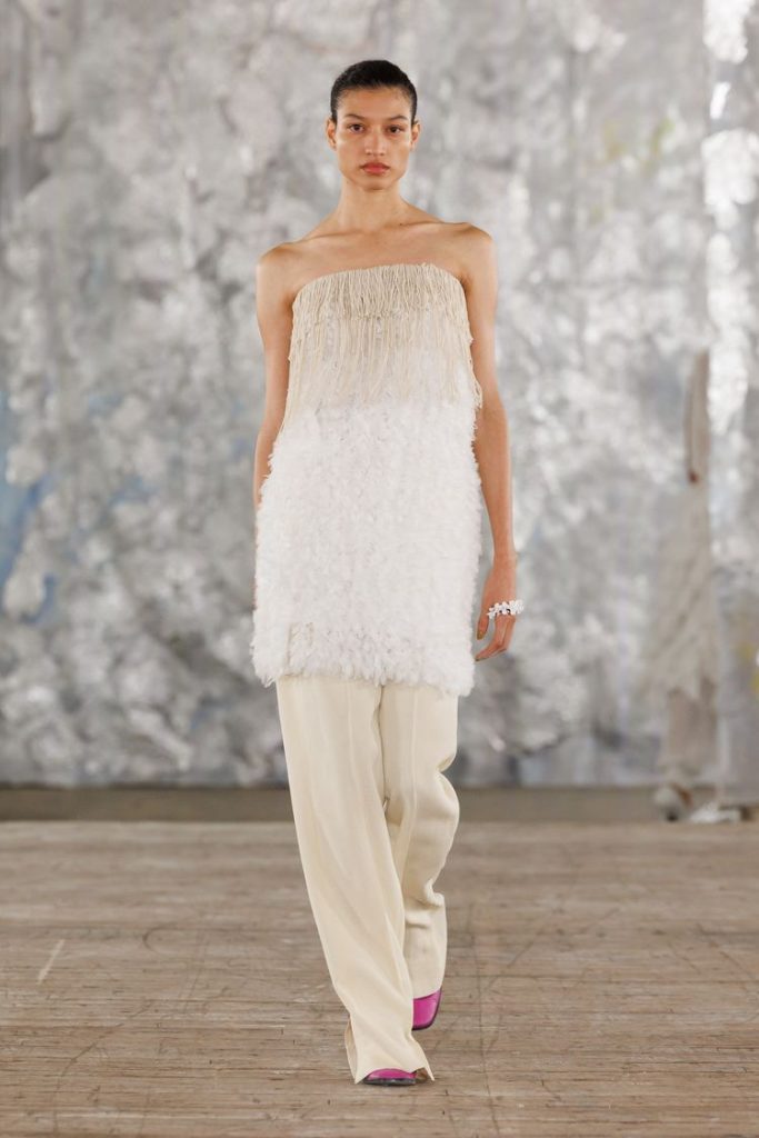 At Area, an attendee wears a scarf dress over trousers. Getty Images