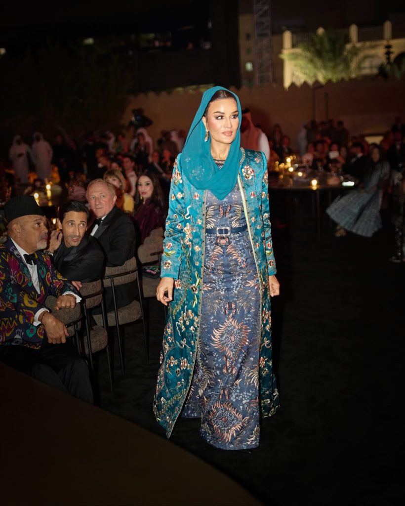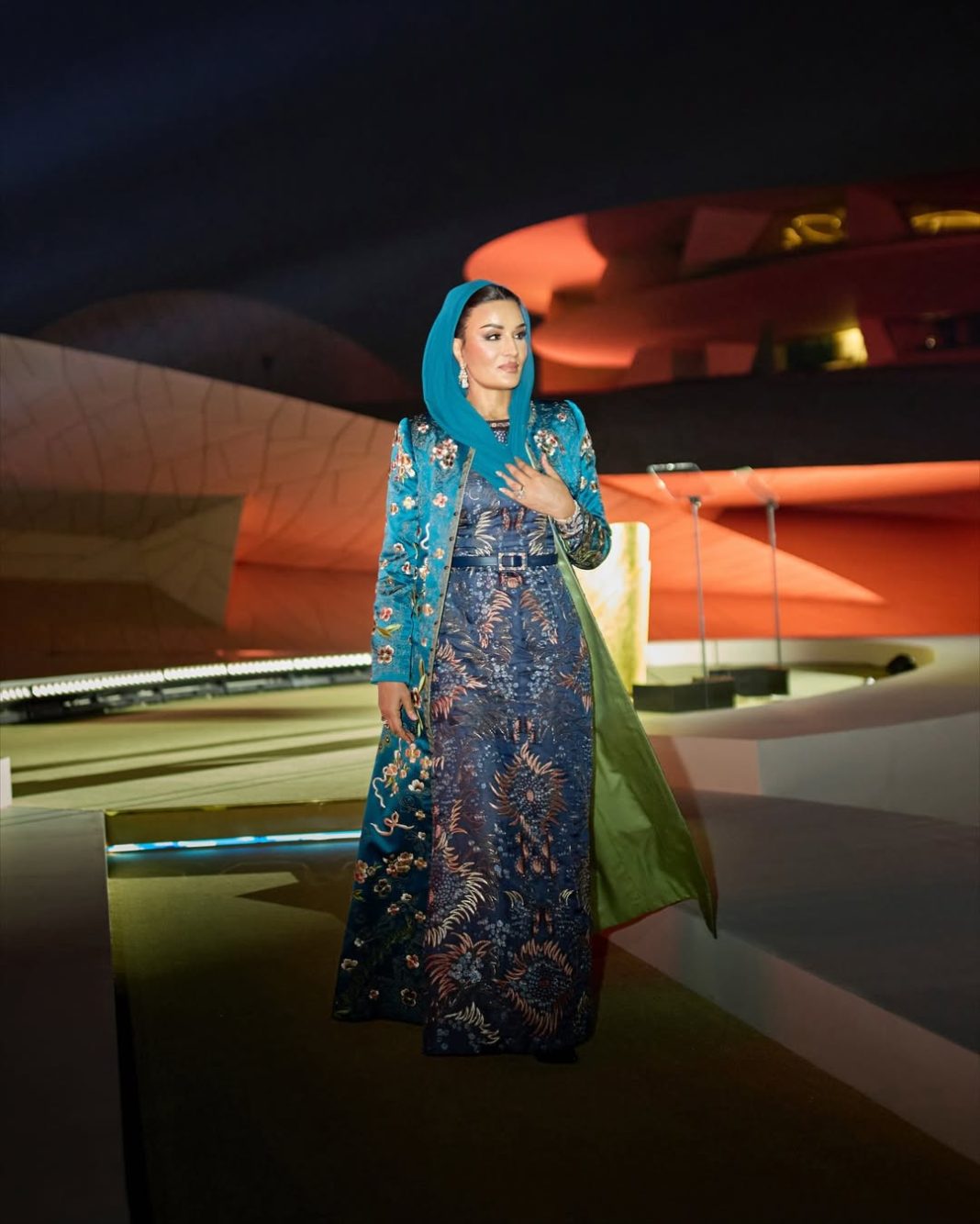 اختارت الشيخة موزا إطلالة مستوحاة من القفطان المغربي الفخم، جاءت بلون أزرق بترولي جذاب، مطرّز بخيوط البيج الراقية. وتألقت بعباءة كاب مطرّزة من الخارج ومبطّنة بالأخضر، أضفت على الإطلالة بُعداً بيانياً مميزاً.